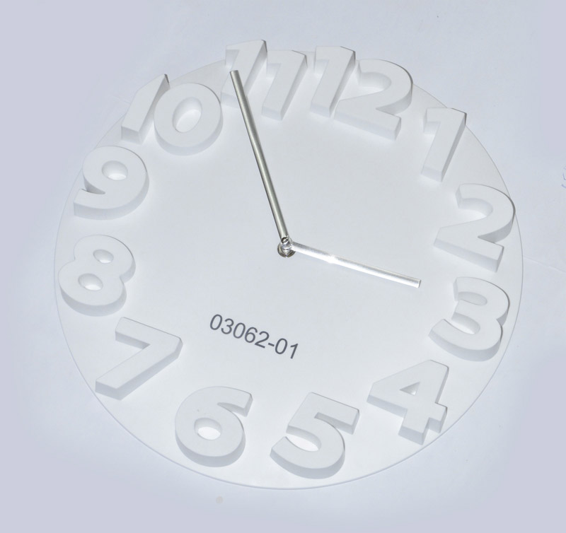 Duży zegar o nowoczesnym wyglądzie. Dzięki wypukłym cyfrom godzina jest bardzo dobrze widoczna.