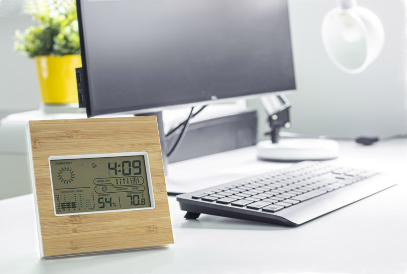 JUPITER to stacja pogody z możliwością pomiaru temperatury wewnątrz pomieszczenia. Posiada następujące funkcje: godzina, data, dzień tygodnia, temperatura wewnętrzna, wilgotność powietrza, poziom komfortu, wizualizacja pogody oraz budzik. Przód obudowy pokryty jest warstwą bambusową, co doskonale współgra z minimalistyczną stylistyką wnętrz.
