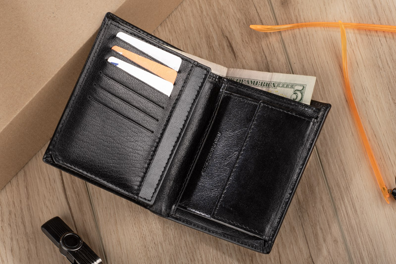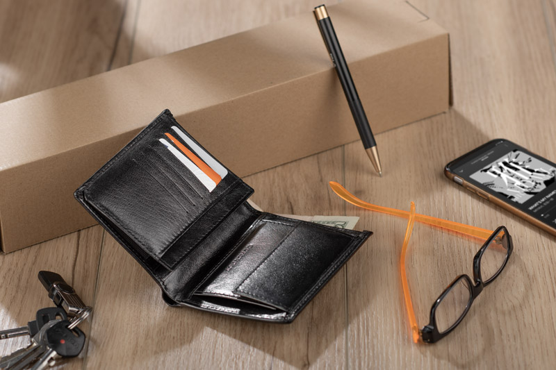 Portfel wyposażony w miejsce na bilon, 2 kieszenie na banknoty, 6 miejsc na karty kredytowe, 5 kieszeni na dokumenty. Dodatkowo został wzbogacony o folię zabezpieczającą przed kradzieżą danych z kart kredytowych, blokując sygnał RFID. Portfel pakowany w drewniane pudełko. Na portfelach wykonujemy tłoczenie lub grawer. Istnieje także możliwość wykonania graweru na pudełku.