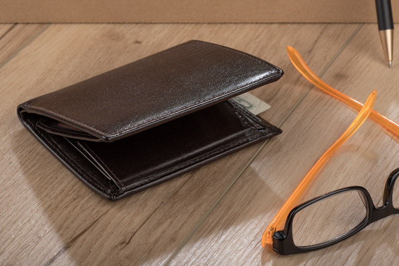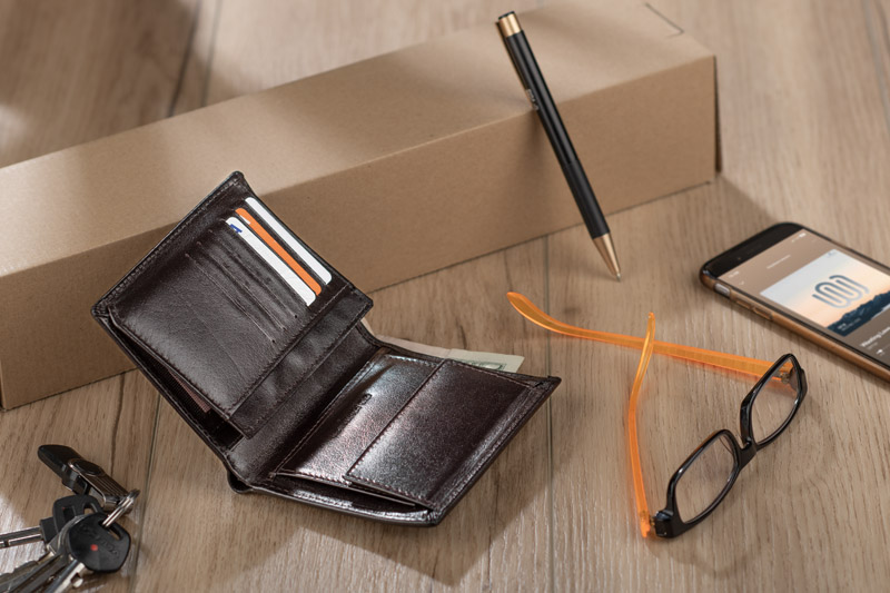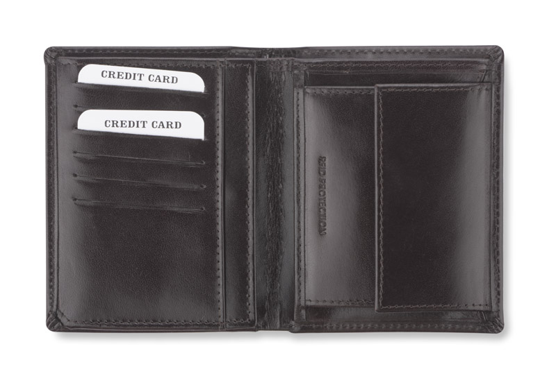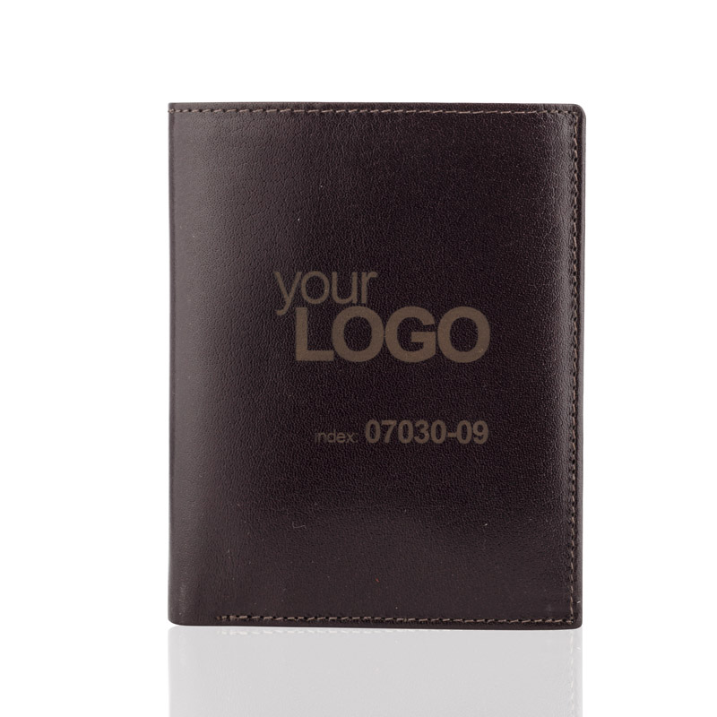 Portfel wyposażony w miejsce na bilon, 2 kieszenie na banknoty, 6 miejsc na karty kredytowe, 5 kieszeni na dokumenty. Dodatkowo został wzbogacony o folię zabezpieczającą przed kradzieżą danych z kart kredytowych, blokując sygnał RFID. Portfel pakowany w drewniane pudełko. Na portfelach wykonujemy tłoczenie lub grawer. Istnieje także możliwość wykonania graweru na pudełku.