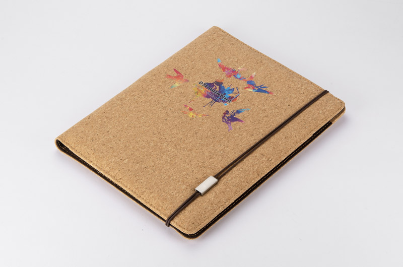 Korkowa teczka A4 z notatnikiem. Zawiera dużą kieszeń do przechowywania dokumentów, dwie mniejsze kieszonki oraz miejsce na długopis. Zamykana za pomocą gumki z metalowym elementem. Zapakowana w woreczek non woven.