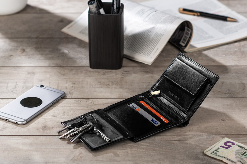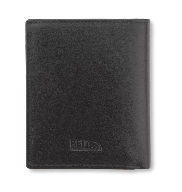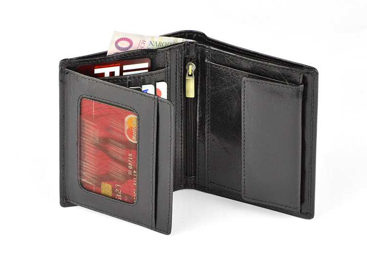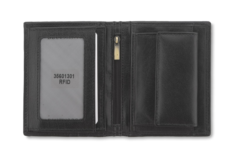 Portfel wyposażony w miejsce na bilon, 2 kieszenie na banknoty, 4 miejsca na karty kredytowe, 5 kieszeni na dokumenty, kieszeń zapinaną na suwak. Portfel pakowany w drewaniane pudełko. Dodatkowo portfel wyposażony jest w folię zabezpieczającą przed kredzieżą danych z kart kredytowych, blokując sygnał RFID. Logo wykonamy metodą tłoczenia lub grawerowania.