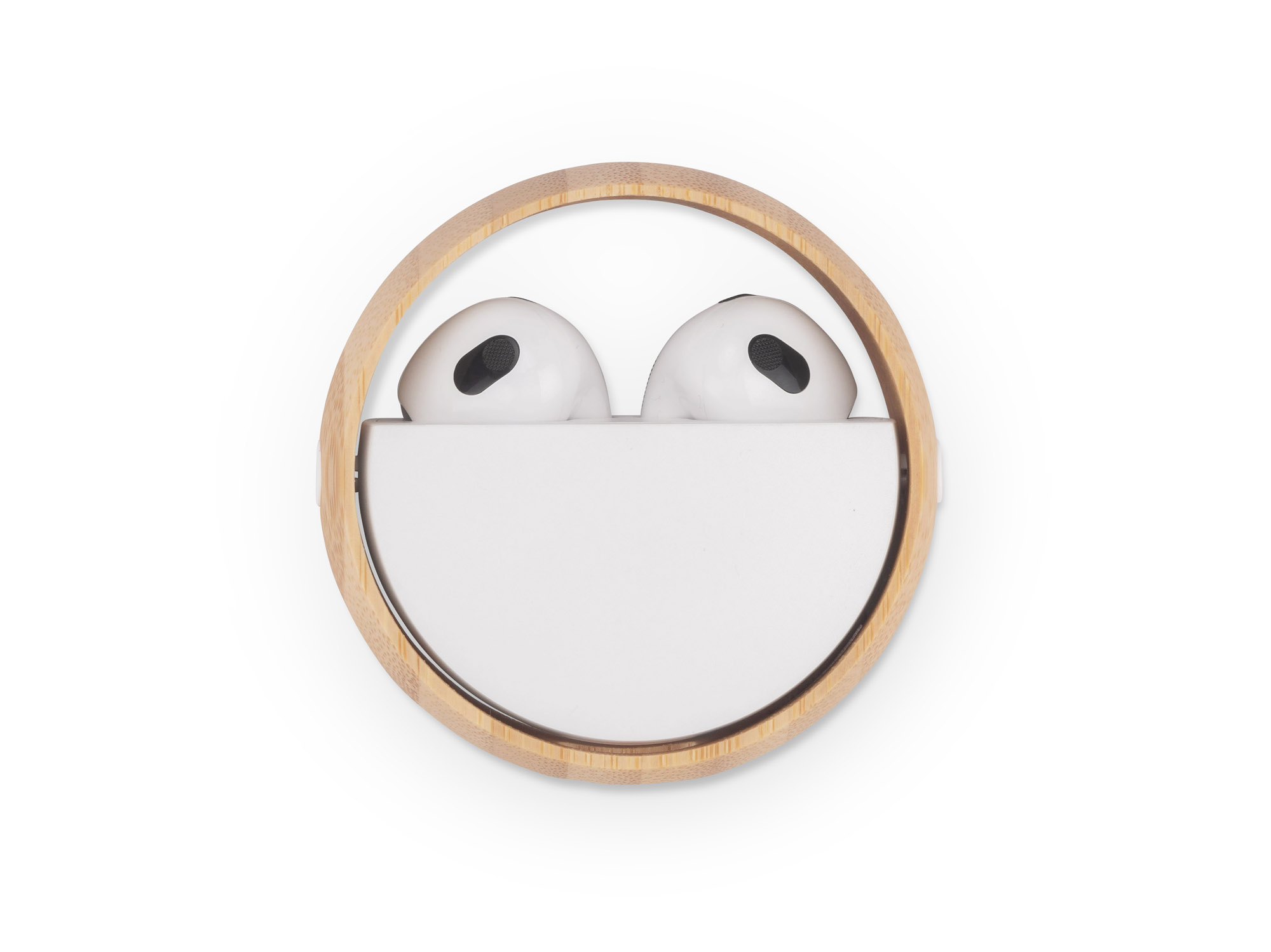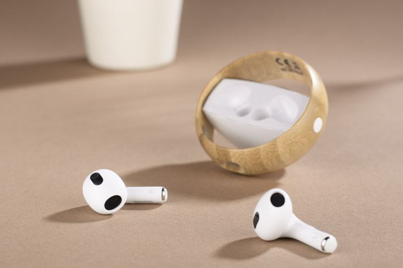 Słuchawki bezprzewodowe SPOTI to stylowy i nowoczesny gadżet. Zapakowane w poręczne okrągłe etui, które poprzez połączenie bieli i bambusa prezentuje się bardzo efektownie. Poręczny, mały rozmiar pozwoli cieszyć się wygodą użytkowania. Dane techniczne: wersja bluetooth 5.0, pojemność baterii w każdej słuchawce 30mAh, pojemność baterii w etui 230 mAh, czas pracy 3-4 godziny, czas ładowania 1-2 godziny, port ładowania typu C.