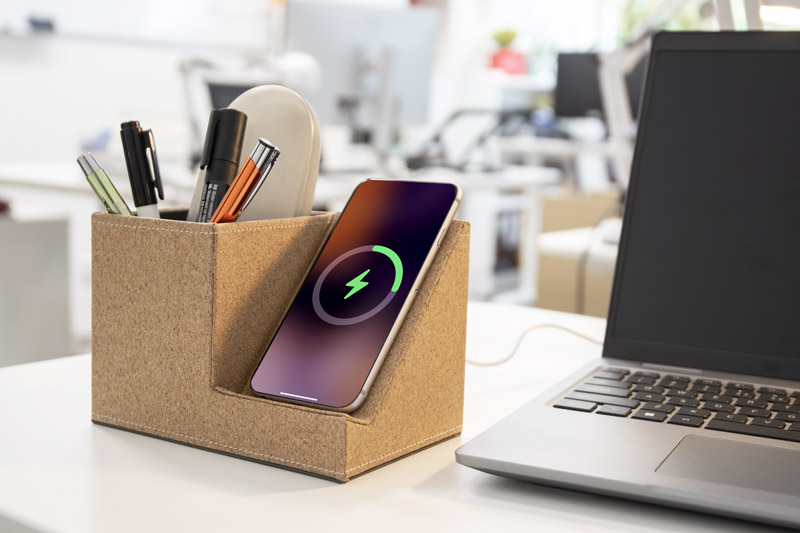 COVBI to funkcjonalny organizer na biurko wykonany z naturalnego korka. Gadżet łączy w sobie przybornik na akcesoria do pisania z bezprzewodową ładowarką o mocy 15W, idealną do szybkiego ładowania telefonu. Dodatkowo, w zestawie znajduje się kabel USB-C, który zapewnia szybkie i bezpieczne podłączenie do zasilania. COVBI wprowadzi porządek i nowoczesną technologię do Twojej przestrzeni roboczej.