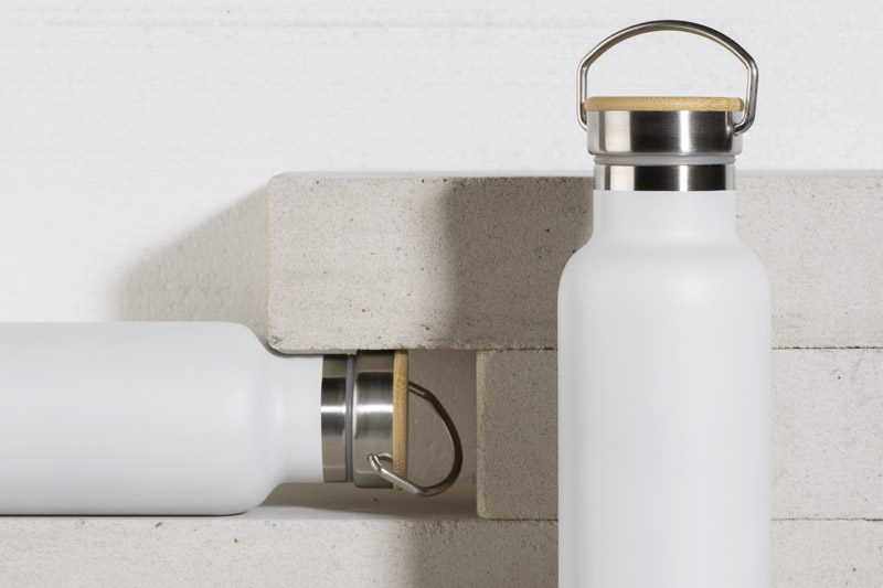 Butelka termiczna KAAN wykonana ze stali nierdzewnej o podwyższonym standardzie. Posiada ciekawy design uchwytu oraz zakrętki z bambusowym wykończeniem. Posiada próżnię między ściankami, dzięki czemu utrzymuje temperaturę napoju do około 10 godzin.