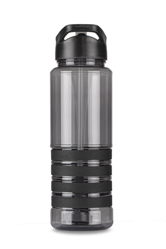 Bidon KIVI o pojemności 700 ml posiada bardzo wygodny chowany ustnik ze słomką. Jego największym atutem jest zastosowany filtr węglowy, dzięki któremu możemy go napełnić nawet wodą z kranu. Filtr możemy również wyjąć gdy chcemy do bidonu nalać np. sok. Filtr można łatwo wymienić po zalecanym czasie stosowania (około 300 napełnień lub po upływie 2 miesięcy). Pewny uchwyt i sportowy wygląd zapewniają silikonowe opaski.