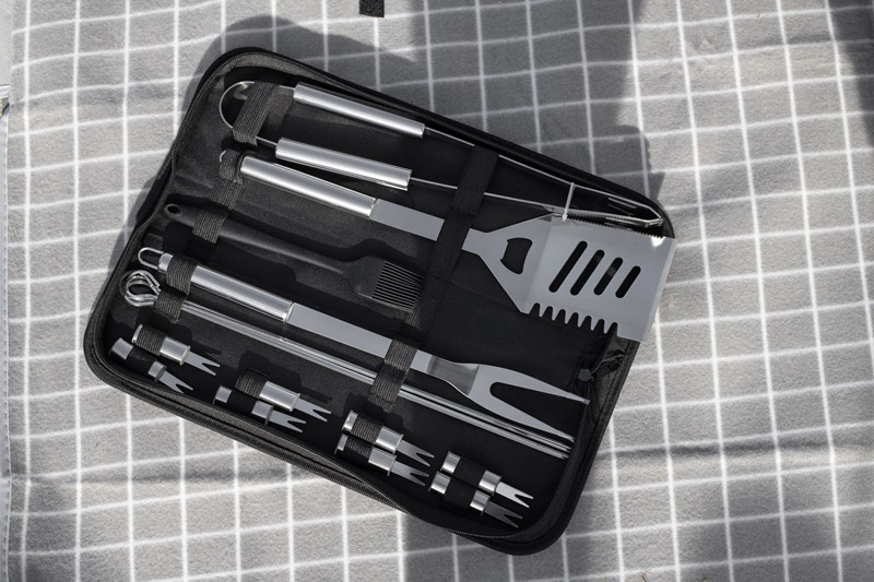 Zestaw do grilla ROLAN w poliestrowym etui zawiera 16 elementów ze stalowymi rączkamii: 4 szpikulce do szaszłyków, szczypce, łopatkę z otwieraczem do butelek, widelec, 8 uchwytów do kolb kukurydzy oraz silikonowy pędzelek.