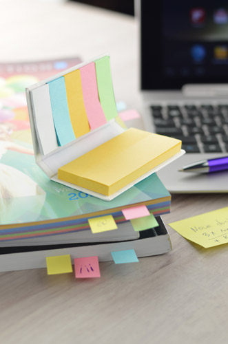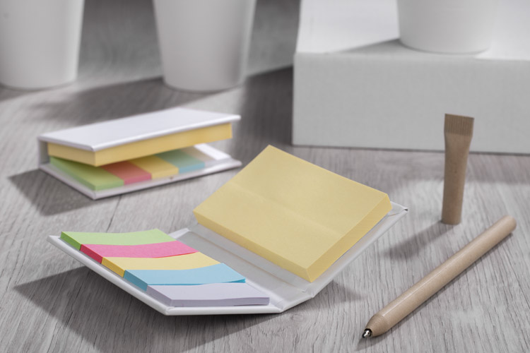 LECTURE to mały, podręczny notesik z kompletem karteczek samoprzylepnych. Zawiera 5 kolorów małych karteczek po 25 szt./kolor oraz 70 szt. dużych karteczek. Nadruk logo wykonamy na notesiku. Układ poszczególnych kolorów karteczek samoprzylepnych w ramach jednej partii może się różnić.