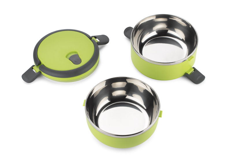 Pojemnik z wnętrzem ze stali nierdzewnej podzielony na dwie komory, które składamy jedną na drugą, co zapewnia poręczne i wygodne przenoszenie dwudaniowych posiłków. Górna komora wyposażona w uszczelkę. Uchwyty z tworzywa sztucznego z możliwością złożenia. Łączna pojemność: 1400 ml.