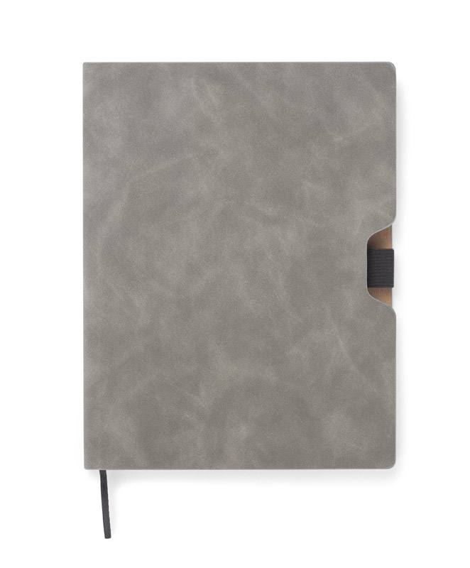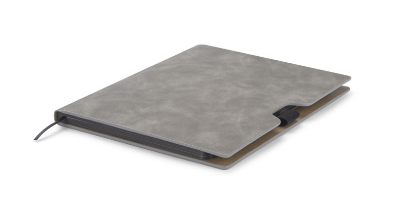 BLAKK to klasyczny notes w okładce z materiału skóropodobnego (PU) w szarym kolorze. Czarne krawędzie kartek nadają mu elegancki wygląd. Notes zawiera 80 białych kartek w linie wykonanych z papieru. Okładka posiada gumkę - uchwyt na długopis oraz czarną zakładkę - wstążeczkę.