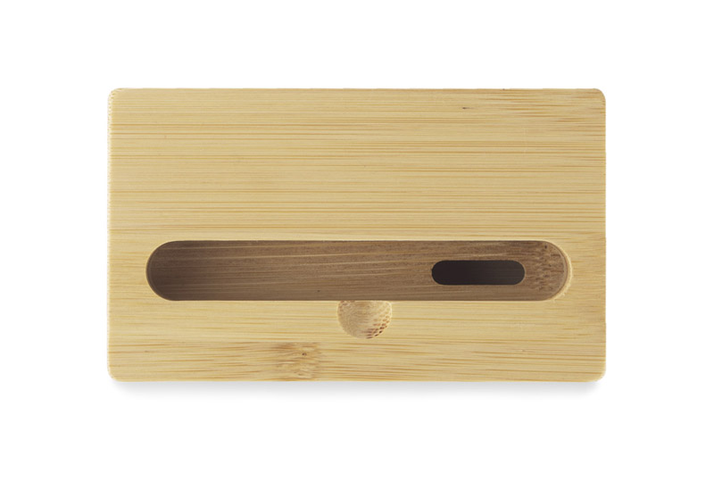 RESONA to bambusowy stojak na telefon pełniący jednocześnie funkcję wzmacniacza dźwięku. Jego wyprofilowany kształt sprawia, że dźwięk wydobywający się z telefonu umieszczonego w środku, jest głębszy i mocniejszy. Stojak zapakowany w brązowy kartonik z infografiką sugerującą jego działanie.