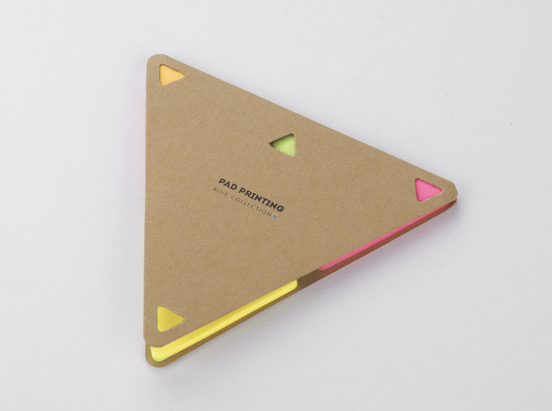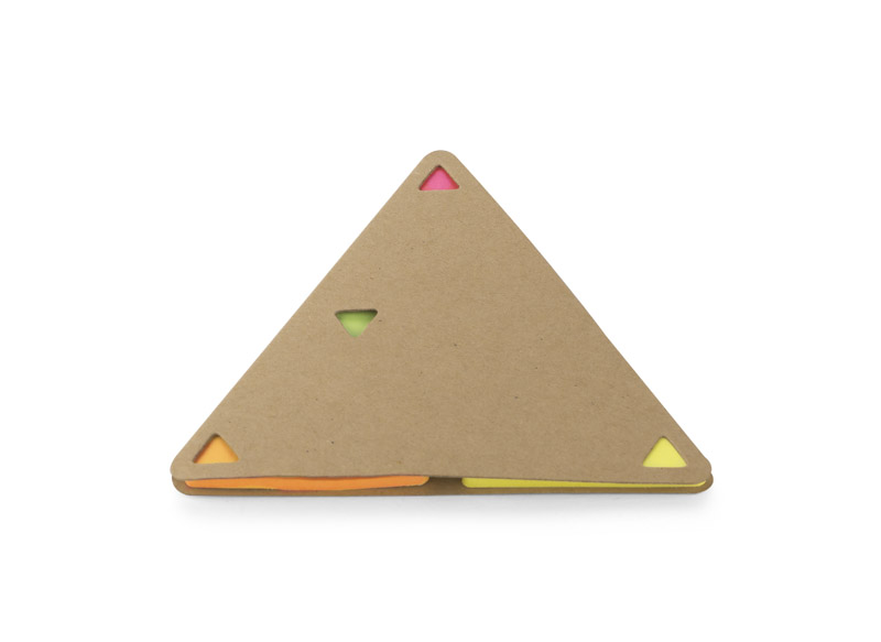 Karteczki samoprzylepne PEL w kształcie trójkąta z ekologiczną papierową okładką. Wewnątrz znajduje się 25 sztuk karteczek w 4 kolorach: pomarańczowym, różowym, zielonym, żółtym.
