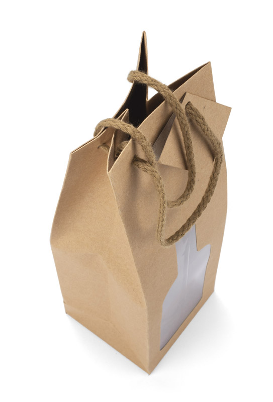 Torebka na wino z okienkiem w kształcie butelki znakomicie wyeksponuje zapakowany w nią produkt. Torebka wykonana jest z papieru.