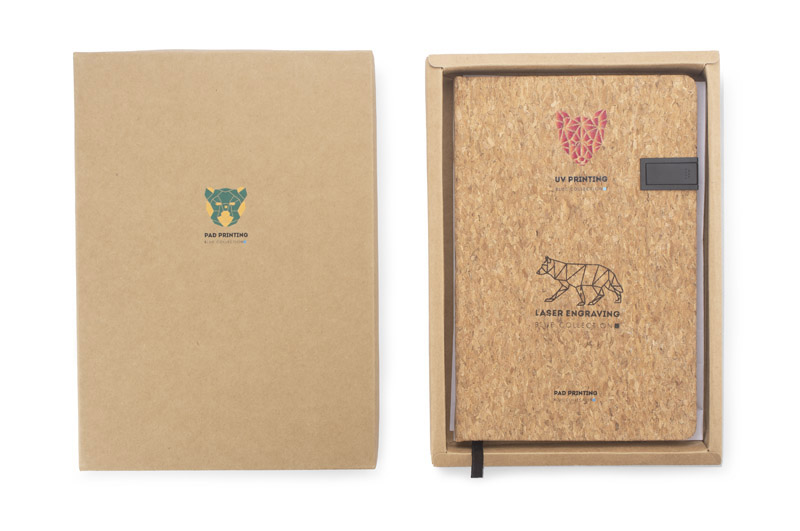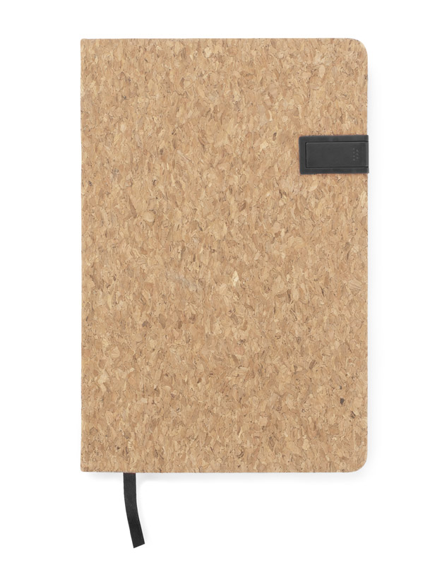Notes w twardej korkowej oprawie. W okładce została umieszczona pamięć USB o pojemności 16 GB. Zawiera 80 kartek w linie. Kartki w notesie wyprodukowane z papieru.