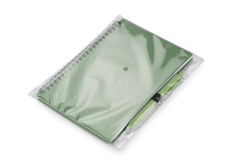 Notes TRESA z długopisem, kolorystyką dopasowanym do okładki. Długopis oraz okładka notesu wykonane są ze słomy pszenicznej. Notes na spirali, posiada 70 kartek w kratkę wykonanych z recyklingowanego papieru. Format A5. Wkład w długopisie w kolorze niebieskim.