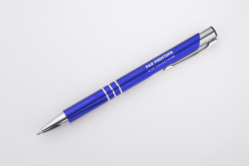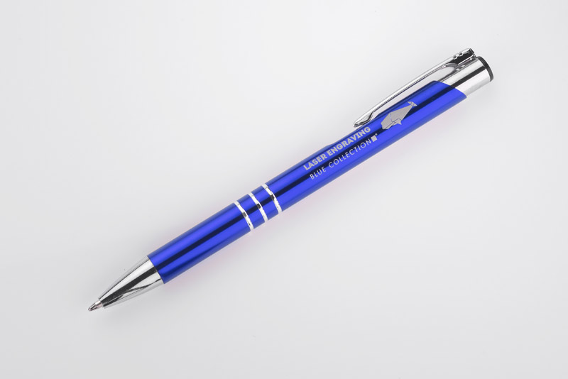 Metalowy długopis o metalizowanej chromowanej powierzchni. Długopis automatyczny z 3 ringami i niebieskim wkładem. Logo grawerujemy na powierzchni długopisu.