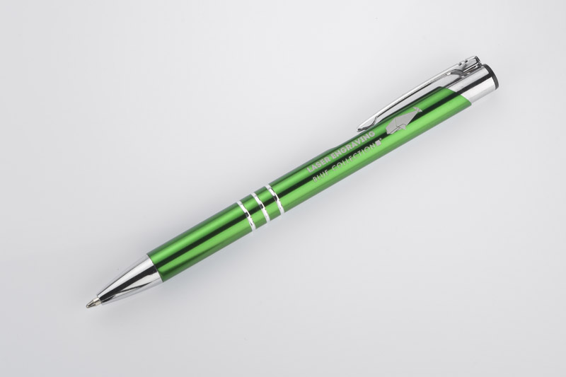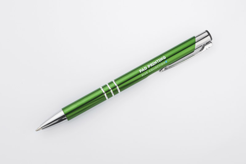 Metalowy długopis o metalizowanej chromowanej powierzchni. Długopis automatyczny z 3 ringami i niebieskim wkładem. Logo grawerujemy na powierzchni długopisu.