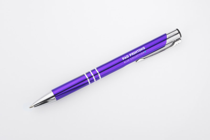 Metalowy długopis o metalizowanej chromowanej powierzchni. Długopis automatyczny z 3 ringami i niebieskim wkładem. Logo grawerujemy na powierzchni długopisu.