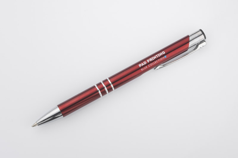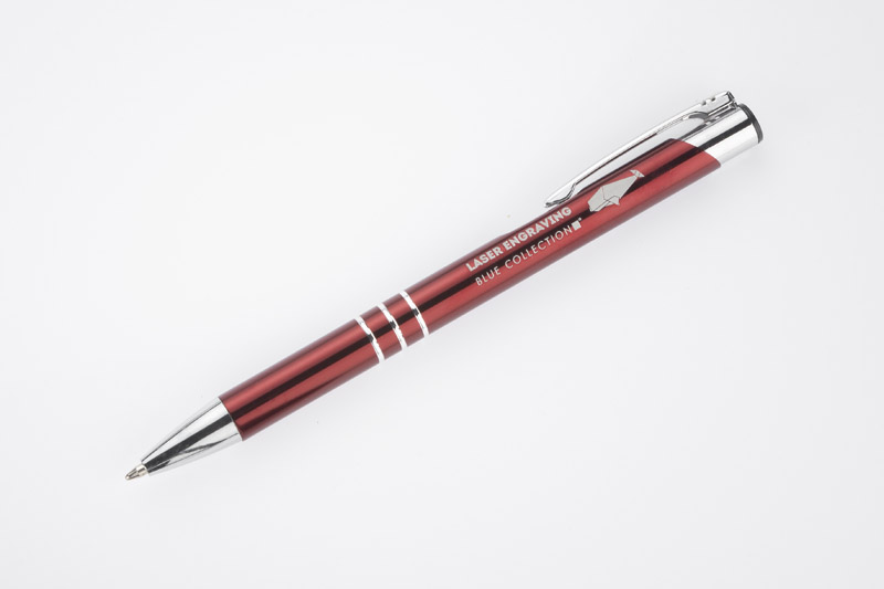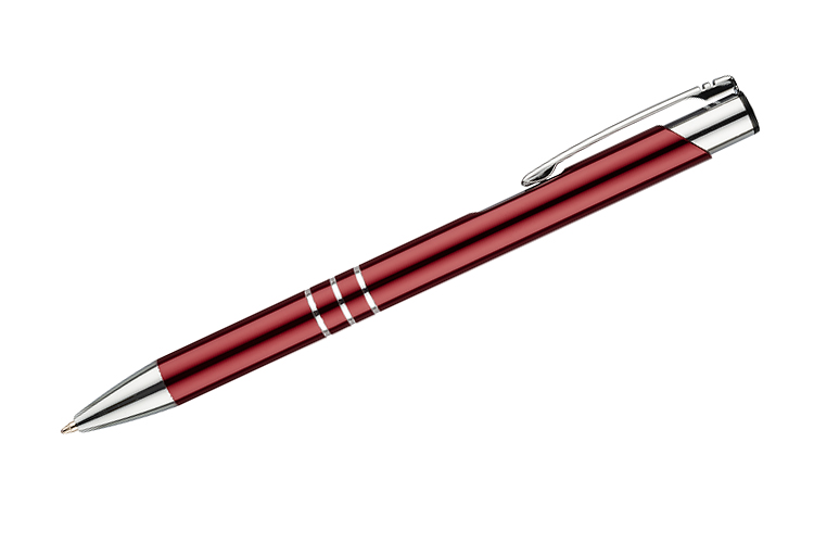 Metalowy długopis KALIPSO o metalizowanej chromowanej powierzchni. Długopis automatyczny z 3 ringami i niebieskim wkładem. Logo grawerujemy na powierzchni długopisu.