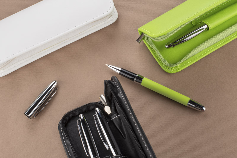 Komplet piśmienniczy: długopis i pióro kulkowe w etui z materiału skóropodobnego (PU). Długopis i pióro kulkowe z wkładami w kolorze niebieskim. Logo wygrawerujemy na artykułach piśmienniczych.