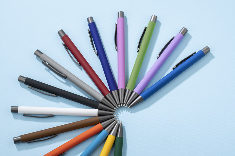Długopis GOMA to prosty design połączony z przyjemną w dotyku gumowaną powierzchnią. Całość jest utrzymana w lekkich, matowych barwach. Wykonany z aluminium. Wykończenia w kolorze grafitowym. Wkład w kolorze czarnym.