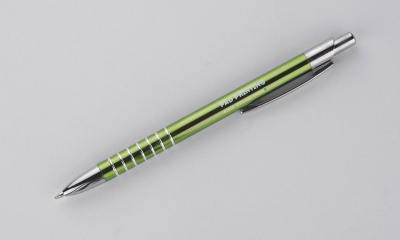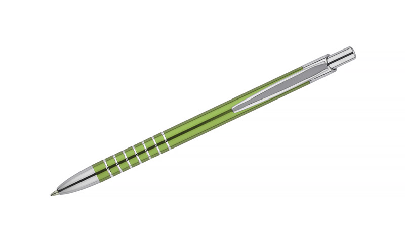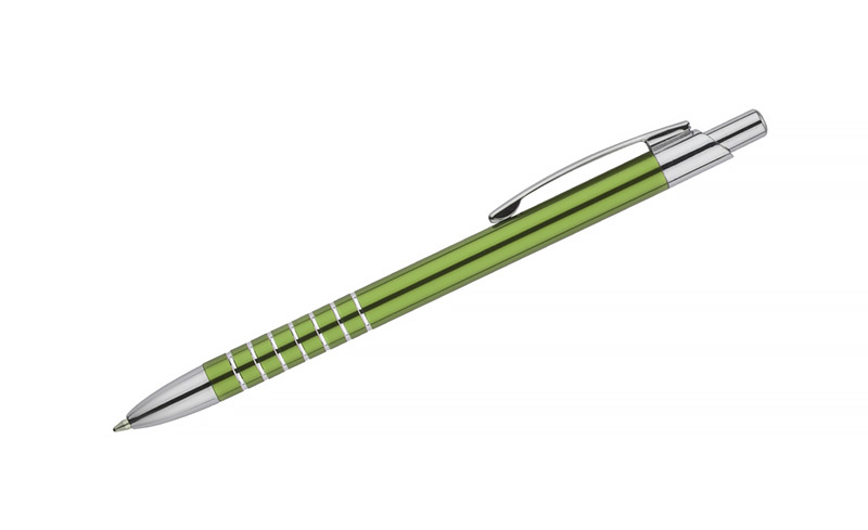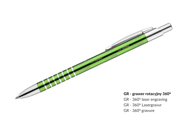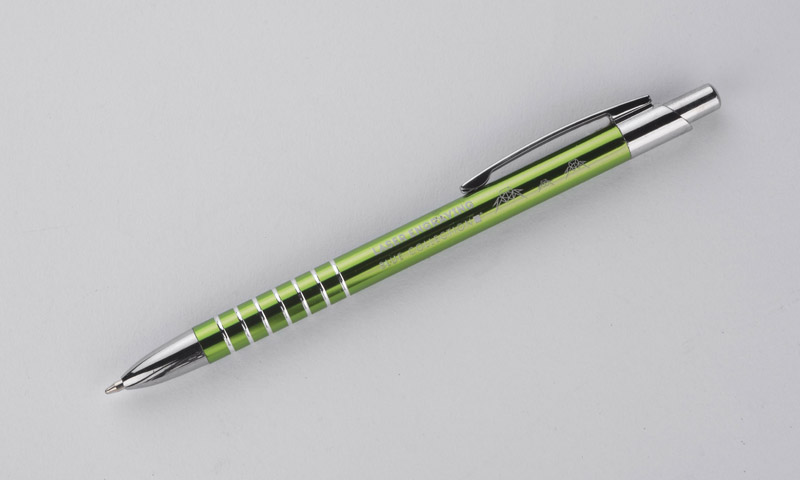 Prosty długopis wykonany z aluminium ozdobiony szerokimi ringami. Logo wygrawerujemy.