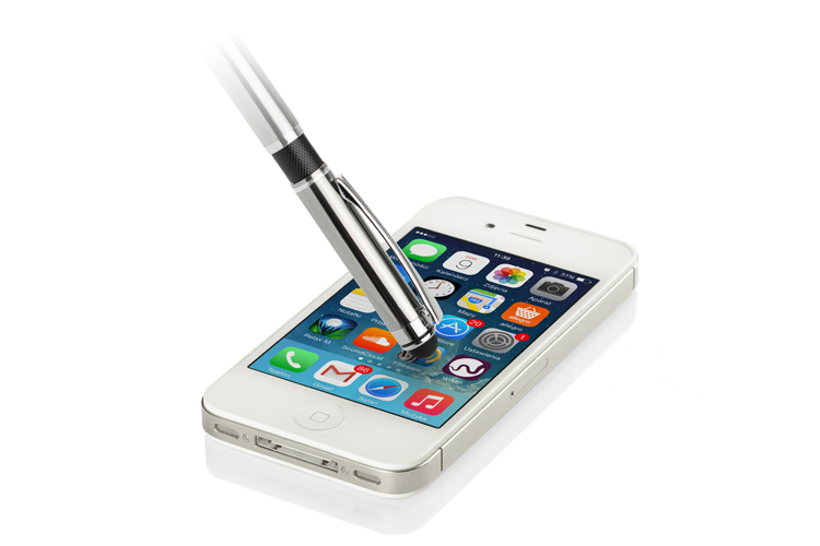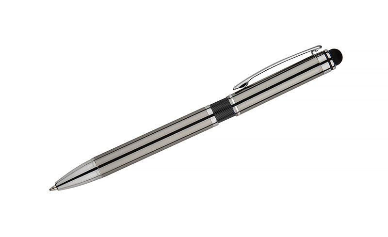 Elegancki metalowy długopis z kolorową aplikacją na korpusie oraz touchpenem.