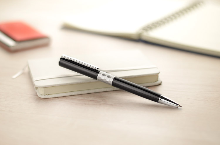 Nowoczesny długopis zaprojektowany zgodnie z najnowszymi trendami. Pośrodku metalowego korpusu znajduje się ozdobny pierścień wyglądem przypominający kryształ, dzięki czemu długopis zyskuje stylowy wygląd. Znakowanie możliwe na korpusie.