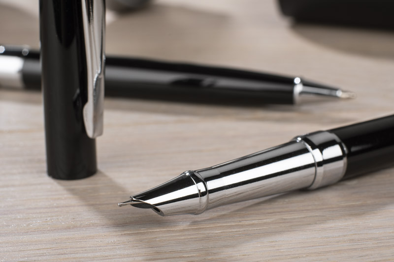 NEVADA to klasyczne, eleganckie pióro wieczne wykonane z metalu. Korpus pokryty farbą. Wykończenia chromowane. Stalówka gustownie schowana wewnątrz. Pióro wyposażone w tłoczek. Możliwość stworzenia zestawu piśmienniczego z długopisem o tym samym wzornictwie.