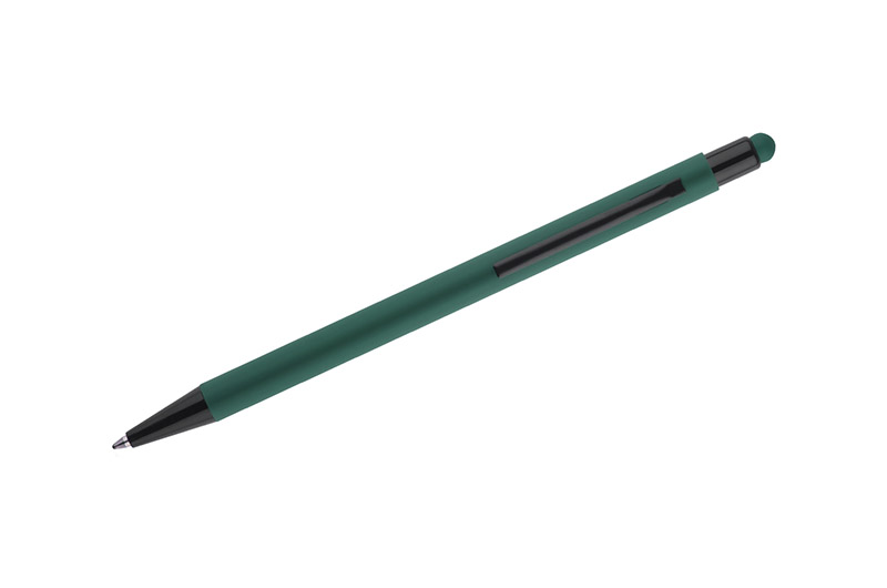 Klasyczny, cienki długopis PRIM wykonany z aluminium pokrytego gumowaną powłoką typu soft touch. Na górze końcówka do obsługi ekranów dotykowych w kolorze dopasowanym do korpusu długopisu. Wykończenia w kolorze czarnym. Długopis automatyczny. Wkład typu X20 w kolorze niebieskim.