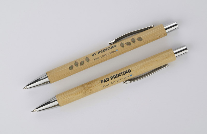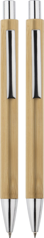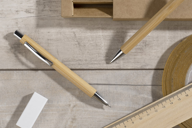 Zestaw piśmienniczy MAMBOO składa się z długopisu oraz ołówka automatycznego zapakowanych w brązowy, ekologiczny kartonik z tektury. Korpus długopisu i ołówka wykonany został z naturalnego bambusa. Chromowane wykończenia nadają mu elegancji. Wkład długopisu w kolorze niebieskim, ołówek automatyczny o grubości 0,7 mm.