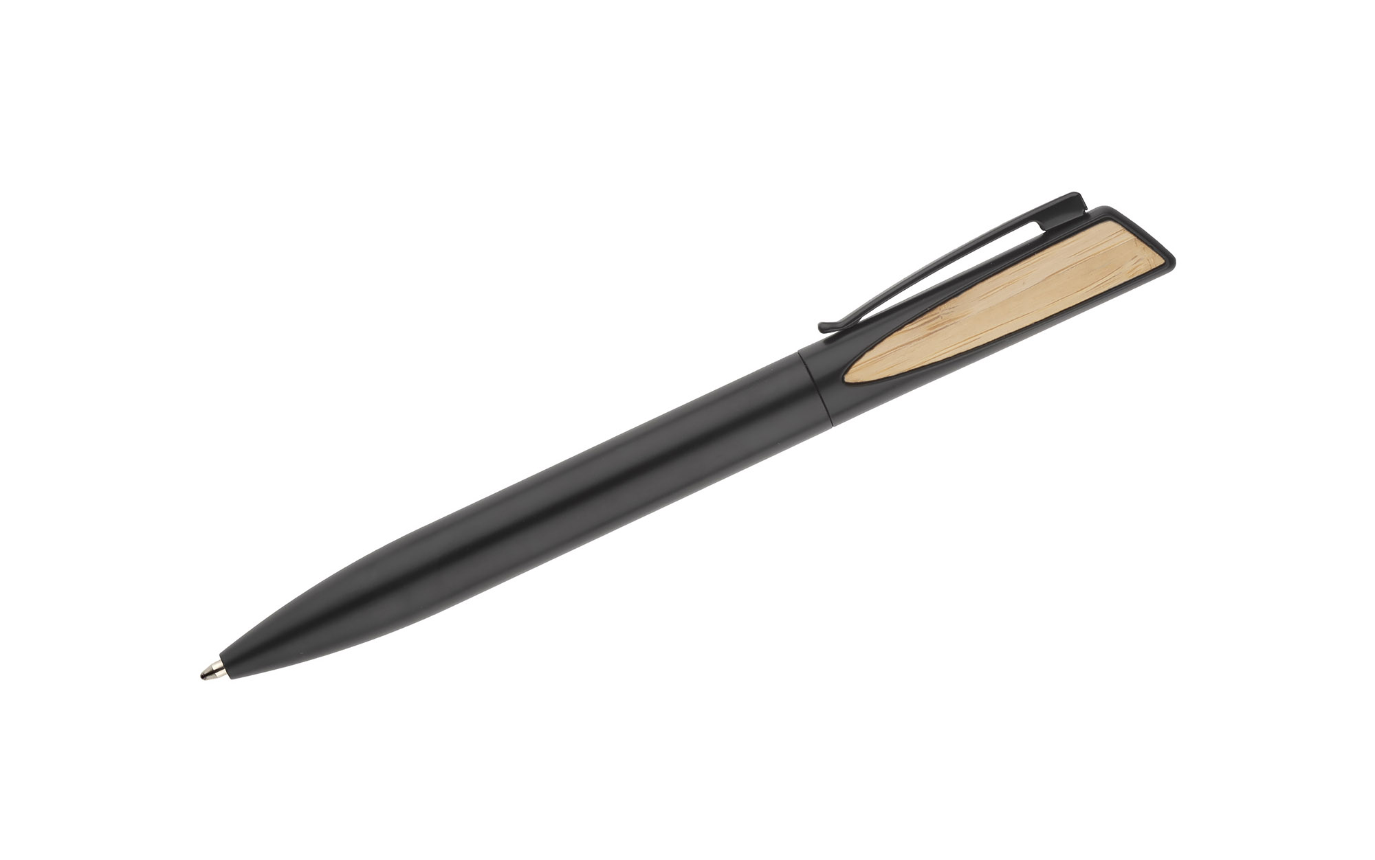 OYA to elegancki długopis wykonany z metalu oraz tworzywa w czarnym kolorze z ciekawym elementem ozdobnym z naturalnego bambusa. Długopis zapakowany jest w papierowy kartonik w kolorze brązowym. Mechanizm typu twist, wkład w kolorze niebieskim.