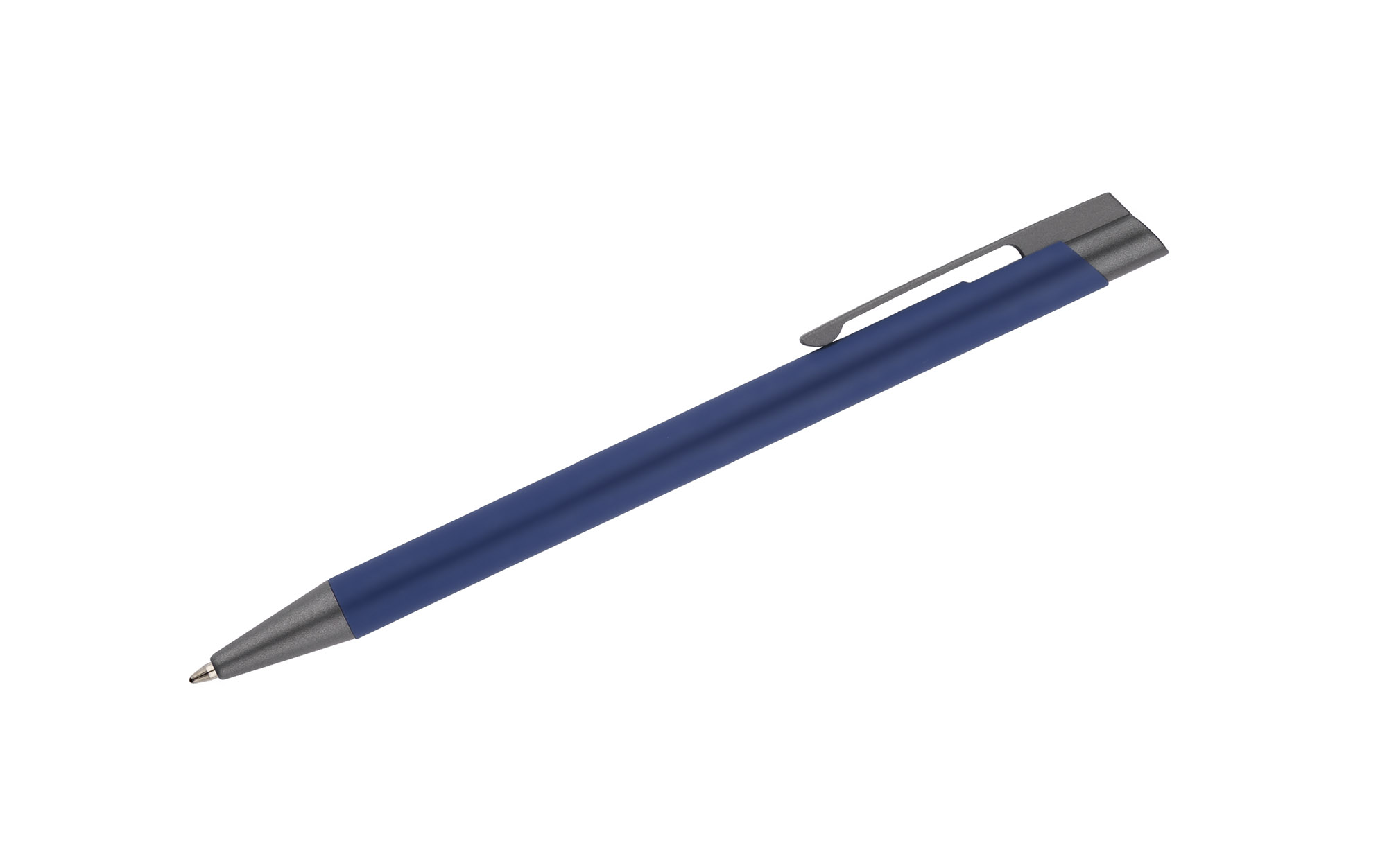 Długopis OPTIMA łączy w sobie elegancję i prostotę. Smukły korpus wykonany został z aluminium i pokryty gumowaną farbą, która tworzy przyjemną w dotyku powłokę. Długopis automatyczny. Wykończenia w kolorze grafitowym. Wkład w kolorze niebieskim.