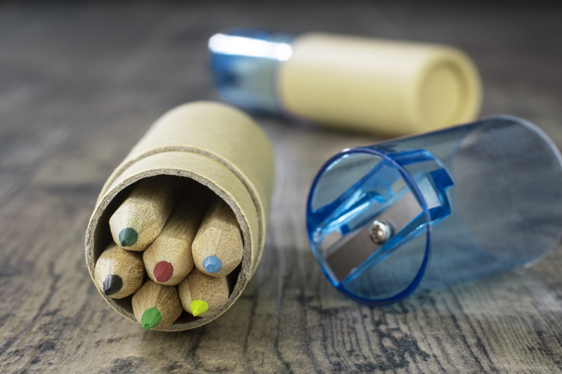 Drewniane kredki w sześciu kolorach. Całość zapakowana w tekturową tubę, która zamykana jest plastikowym zamknięciem zawierającym temperówkę. Logo nadrukujemy na tubie.