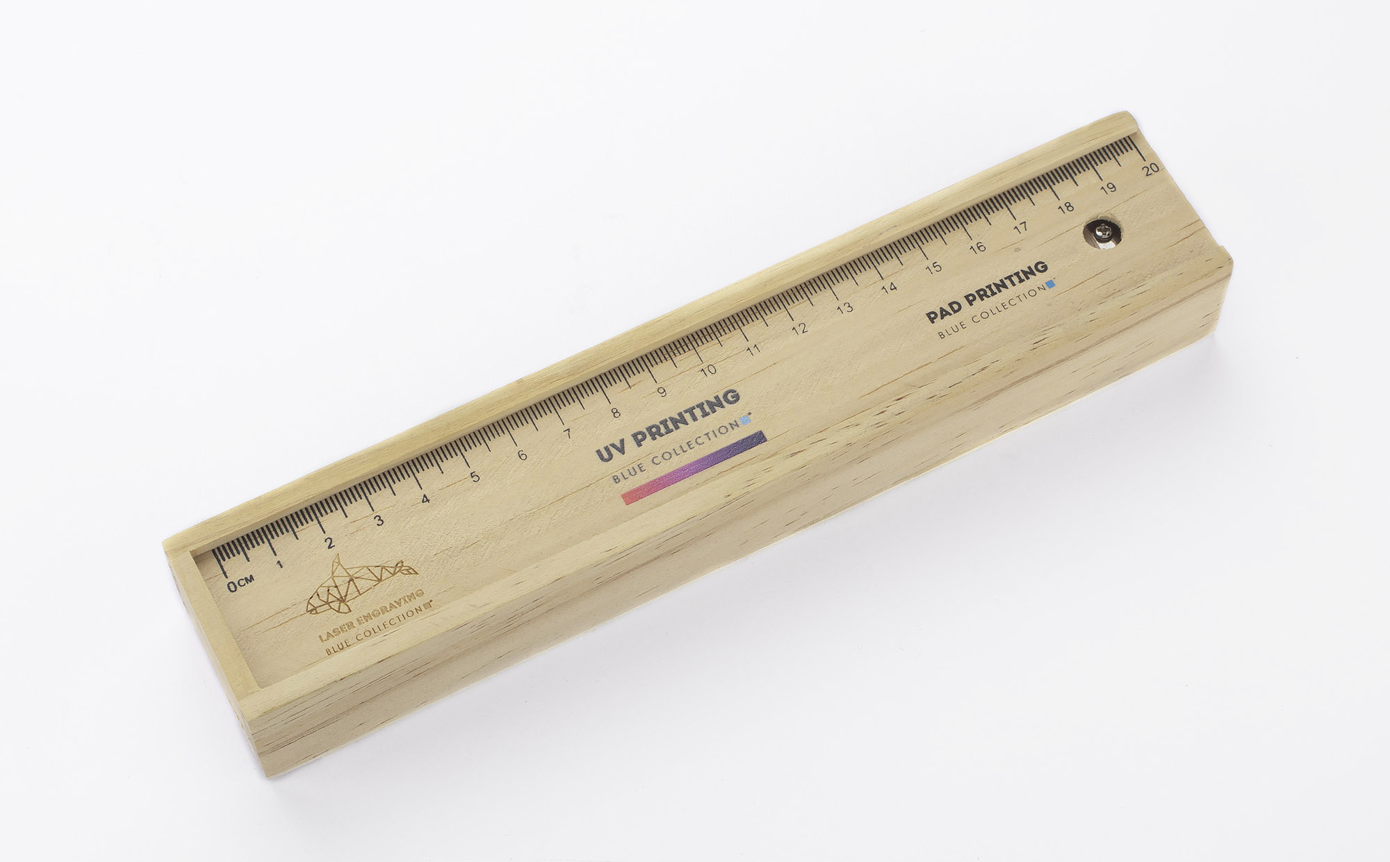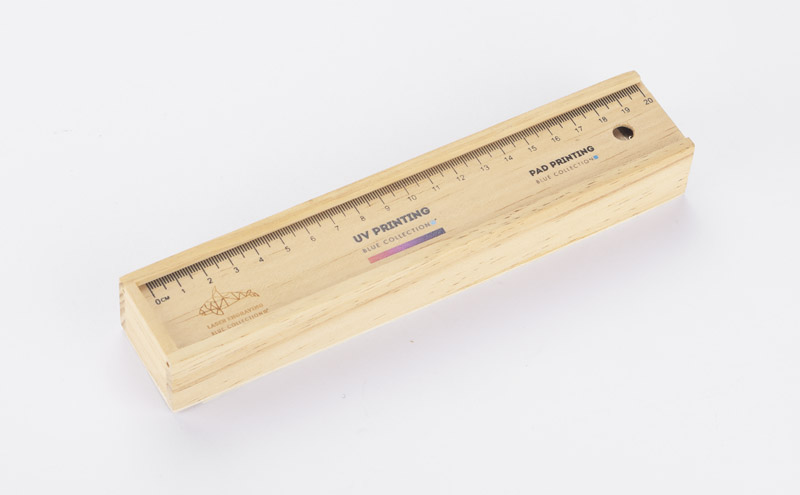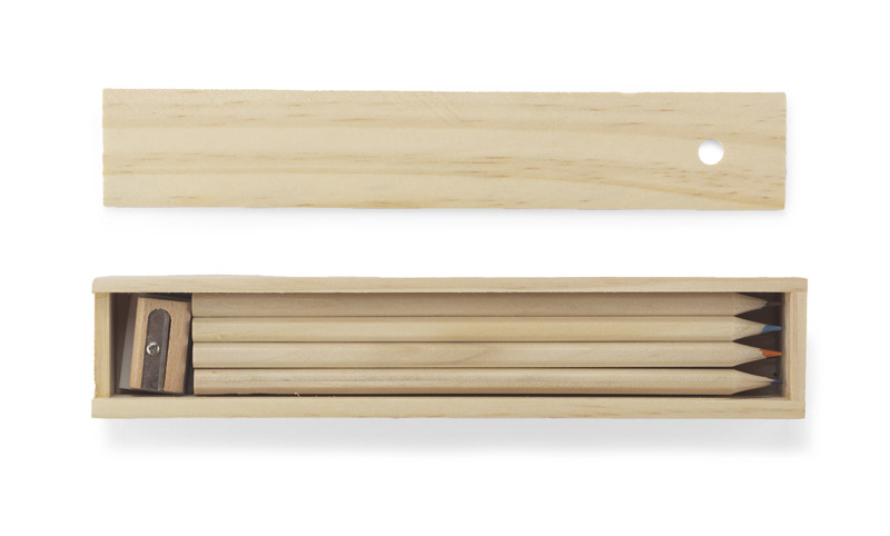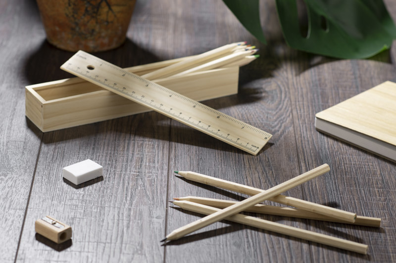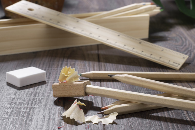 Drewniany piórnik wyposażony w dwanaście drewnianych kredek, linijkę, gumkę oraz temperówkę. Logo grawerujemy bezpośrednio na pudełku.