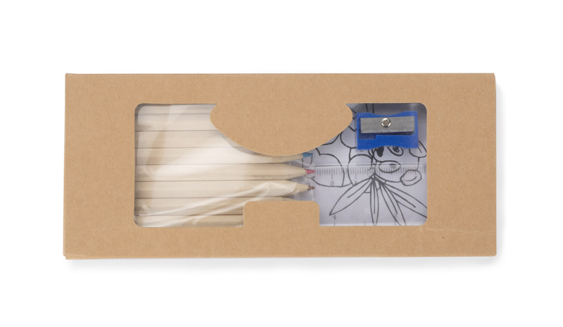 Zestaw małego artysty zawierający kolorowankę, dziesięć drewnianych kredek, linijkę oraz temperówkę. Logo nadrukujemy na kartoniku.