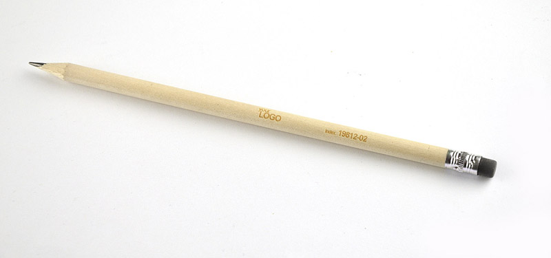 Klasyczny, drewniany ołówek z gumką. Twardość HB. Ołówek zatemperowany. Logo wygrawerujemy lub nadrukujemy na powierzchni ołówka.
