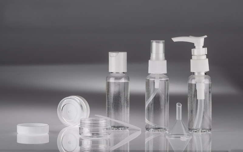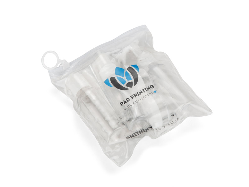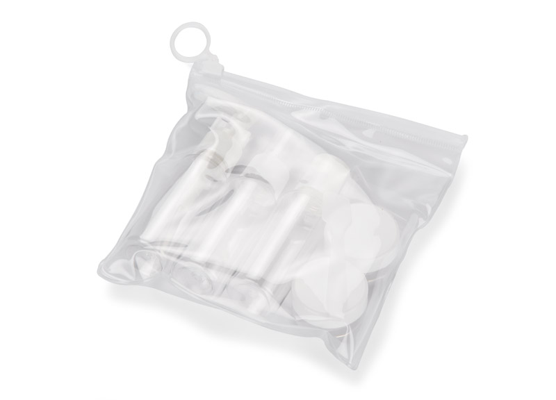 Praktyczny zestaw pojemników podróżnych AIRO umożliwia wygodne i higieniczne przechowywanie kosmetyków podczas podróży. W jego skład wchodzą: buteleczka z atomizerem, buteleczka z pompką, buteleczka z zamknięciem oraz dwa słoiczki. Dołączony lejek ułatwia precyzyjne przelewanie płynów, a łyżeczka jest idealna do przekładania kosmetyków o kremowej konsystencji. Przezroczyste pojemniki z białymi nakrętkami ułatwiają identyfikację zawartości. Zestaw zawiera także etui, z jednej strony przezroczyste, a z drugiej mleczne, zamykane strunowo. Kompaktowe rozmiary pojemników spełniają wymogi linii lotniczych.