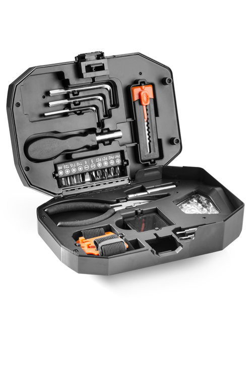 Wielofunkcyjny zestaw narzędzi ETI skrywa swoją funkcjonalność w środku latarki. W jej wnętrzu znajdują się wszystkie najpotrzebniejsze narzędzia takie jak: śrubokręt z zestawem wymiennych bitów, 3 klucze imbusowe, wysuwany nożyk, dwa śrubokręty precyzyjne, miarka oraz kombinerki. Najciekawszym elementem zestawu jest lampka z dwoma trybami świecenia, którą można używać jako lampki stacjonarnej wyciągając rozkładane ramię. Dodatkowo lampkę można odczepić od podstawy i przymocować na zawartym w zestawie pasku, otrzymując w ten sposób wygodną czołówkę.