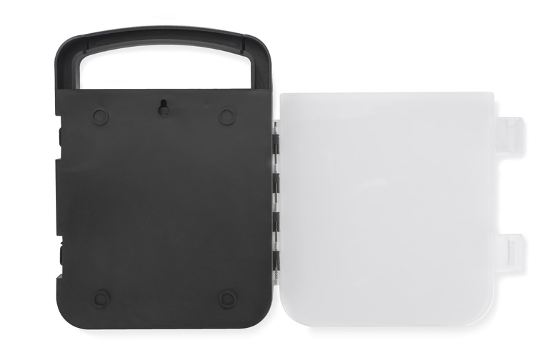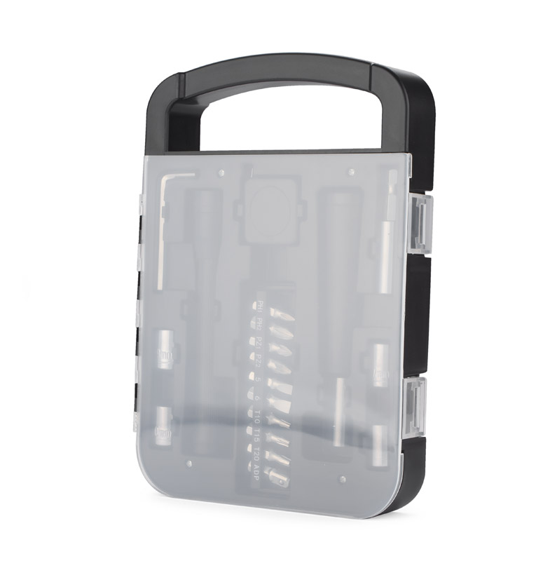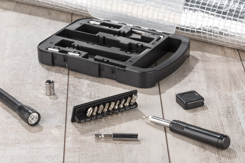 FIXO to zestaw narzędzi w praktycznej obudowie. Wewnątrz znajdują się: klucz imbusowy, latarka, miara, wkrętak, dziesięć różnych bitów, przedłużka i cztery końcówki nasadowe 7mm, 8mm, 9mm i 10mm.