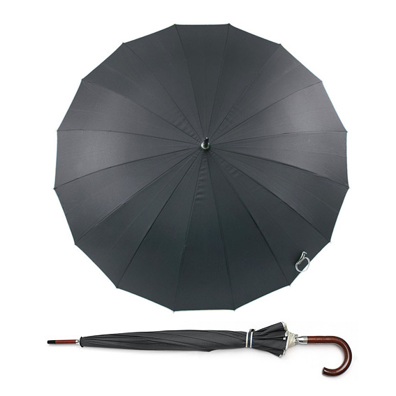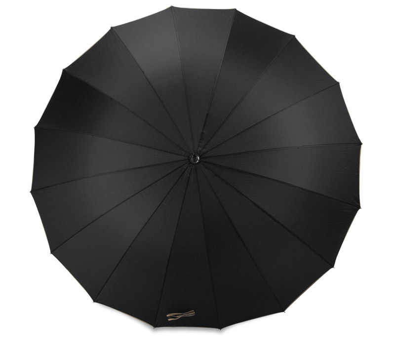 Bardzo elegancki parasol manualny, szesnasto panelowy, zakończony drewnianą zakrzywioną rączką. Wykonany z materiału typu pongee 190 T. Śr czaszy po rozłożeniu to 112 cm, długość złożonego parasola to 90 cm. Szerokość panelu wynosi 22 cm. Nadruk logo wykonamy na czaszy parasola metodą sitodruku.