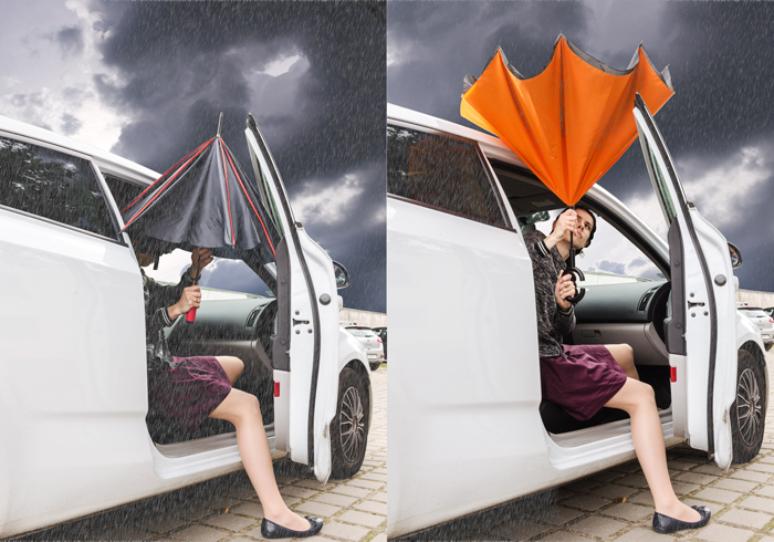 Rewolucyjny parasol REVERS wyróżnia się nie tylko kształtem ale też funkcjonalnością. Poprzez odwrócenie ruchu zamknięcia parasola woda, która osadziła się na czaszy pozostaje wewnątrz. Dzięki temu użytkownik oraz otoczenie pozostają suche. Dodatkowo parasol wyróżnia się charakterystyczną rączką, która jest bardzo przydatna w sytuacjach gdy trzeba wykonać czynność obiema rękoma. Dwustronna czasza wykonana z poliestru 190T.